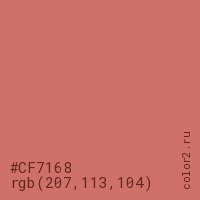 Цвет #CF7168 в цветовой модели RGB обозначается тремя октетами (207, 113, 104) в десятичном формате и #CF7168 в шестнадцатиричном (hex) формате, которые являются интенсивностью красного 207 (hex CF), интенсивность зелёного 113 (hex 71) и интенсивность синего 104 (hex 68).