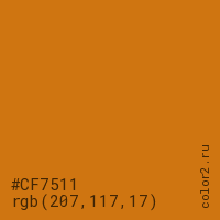 Цвет #CF7511 в цветовой модели RGB обозначается тремя октетами (207, 117, 17) в десятичном формате и #CF7511 в шестнадцатиричном (hex) формате, которые являются интенсивностью красного 207 (hex CF), интенсивность зелёного 117 (hex 75) и интенсивность синего 17 (hex 11).