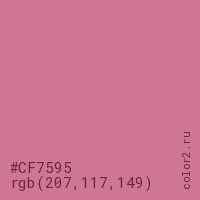 Цвет #CF7595 в цветовой модели RGB обозначается тремя октетами (207, 117, 149) в десятичном формате и #CF7595 в шестнадцатиричном (hex) формате, которые являются интенсивностью красного 207 (hex CF), интенсивность зелёного 117 (hex 75) и интенсивность синего 149 (hex 95).