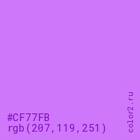 Цвет #CF77FB в цветовой модели RGB обозначается тремя октетами (207, 119, 251) в десятичном формате и #CF77FB в шестнадцатиричном (hex) формате, которые являются интенсивностью красного 207 (hex CF), интенсивность зелёного 119 (hex 77) и интенсивность синего 251 (hex FB).