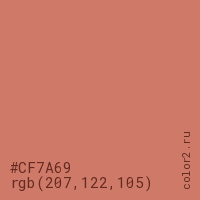 Цвет #CF7A69 в цветовой модели RGB обозначается тремя октетами (207, 122, 105) в десятичном формате и #CF7A69 в шестнадцатиричном (hex) формате, которые являются интенсивностью красного 207 (hex CF), интенсивность зелёного 122 (hex 7A) и интенсивность синего 105 (hex 69).