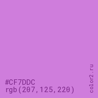 Цвет #CF7DDC в цветовой модели RGB обозначается тремя октетами (207, 125, 220) в десятичном формате и #CF7DDC в шестнадцатиричном (hex) формате, которые являются интенсивностью красного 207 (hex CF), интенсивность зелёного 125 (hex 7D) и интенсивность синего 220 (hex DC).
