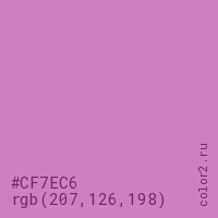 Цвет #CF7EC6 в цветовой модели RGB обозначается тремя октетами (207, 126, 198) в десятичном формате и #CF7EC6 в шестнадцатиричном (hex) формате, которые являются интенсивностью красного 207 (hex CF), интенсивность зелёного 126 (hex 7E) и интенсивность синего 198 (hex C6).