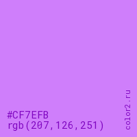 Цвет RGB(207, 126, 251) в процентом отношении количества цвета состоит из 81.2% красного (red), 49.4% зелёного (green) и 98.4% синего (blue).