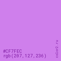 Цвет RGB(207, 127, 236) в процентом отношении количества цвета состоит из 81.2% красного (red), 49.8% зелёного (green) и 92.5% синего (blue).