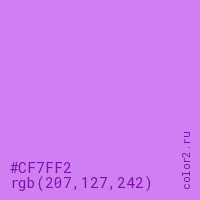 Цвет #CF7FF2 в цветовой модели RGB обозначается тремя октетами (207, 127, 242) в десятичном формате и #CF7FF2 в шестнадцатиричном (hex) формате, которые являются интенсивностью красного 207 (hex CF), интенсивность зелёного 127 (hex 7F) и интенсивность синего 242 (hex F2).