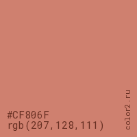 Цвет #CF806F в цветовой модели RGB обозначается тремя октетами (207, 128, 111) в десятичном формате и #CF806F в шестнадцатиричном (hex) формате, которые являются интенсивностью красного 207 (hex CF), интенсивность зелёного 128 (hex 80) и интенсивность синего 111 (hex 6F).