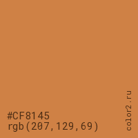 Цвет #CF8145 в цветовой модели RGB обозначается тремя октетами (207, 129, 69) в десятичном формате и #CF8145 в шестнадцатиричном (hex) формате, которые являются интенсивностью красного 207 (hex CF), интенсивность зелёного 129 (hex 81) и интенсивность синего 69 (hex 45).