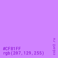 Цвет #CF81FF в цветовой модели RGB обозначается тремя октетами (207, 129, 255) в десятичном формате и #CF81FF в шестнадцатиричном (hex) формате, которые являются интенсивностью красного 207 (hex CF), интенсивность зелёного 129 (hex 81) и интенсивность синего 255 (hex FF).