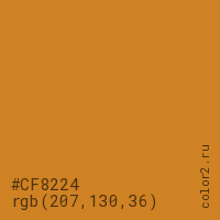 Цвет #CF8224 в цветовой модели RGB обозначается тремя октетами (207, 130, 36) в десятичном формате и #CF8224 в шестнадцатиричном (hex) формате, которые являются интенсивностью красного 207 (hex CF), интенсивность зелёного 130 (hex 82) и интенсивность синего 36 (hex 24).