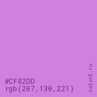 Цвет #CF82DD в цветовой модели RGB обозначается тремя октетами (207, 130, 221) в десятичном формате и #CF82DD в шестнадцатиричном (hex) формате, которые являются интенсивностью красного 207 (hex CF), интенсивность зелёного 130 (hex 82) и интенсивность синего 221 (hex DD).