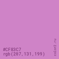 Цвет #CF83C7 в цветовой модели RGB обозначается тремя октетами (207, 131, 199) в десятичном формате и #CF83C7 в шестнадцатиричном (hex) формате, которые являются интенсивностью красного 207 (hex CF), интенсивность зелёного 131 (hex 83) и интенсивность синего 199 (hex C7).
