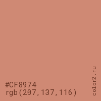 Цвет #CF8974 в цветовой модели RGB обозначается тремя октетами (207, 137, 116) в десятичном формате и #CF8974 в шестнадцатиричном (hex) формате, которые являются интенсивностью красного 207 (hex CF), интенсивность зелёного 137 (hex 89) и интенсивность синего 116 (hex 74).