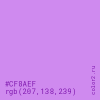 Цвет #CF8AEF в цветовой модели RGB обозначается тремя октетами (207, 138, 239) в десятичном формате и #CF8AEF в шестнадцатиричном (hex) формате, которые являются интенсивностью красного 207 (hex CF), интенсивность зелёного 138 (hex 8A) и интенсивность синего 239 (hex EF).