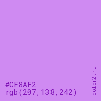 Цвет #CF8AF2 в цветовой модели RGB обозначается тремя октетами (207, 138, 242) в десятичном формате и #CF8AF2 в шестнадцатиричном (hex) формате, которые являются интенсивностью красного 207 (hex CF), интенсивность зелёного 138 (hex 8A) и интенсивность синего 242 (hex F2).