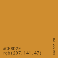 Цвет #CF8D2F в цветовой модели RGB обозначается тремя октетами (207, 141, 47) в десятичном формате и #CF8D2F в шестнадцатиричном (hex) формате, которые являются интенсивностью красного 207 (hex CF), интенсивность зелёного 141 (hex 8D) и интенсивность синего 47 (hex 2F).