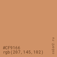 Цвет #CF9166 в цветовой модели RGB обозначается тремя октетами (207, 145, 102) в десятичном формате и #CF9166 в шестнадцатиричном (hex) формате, которые являются интенсивностью красного 207 (hex CF), интенсивность зелёного 145 (hex 91) и интенсивность синего 102 (hex 66).