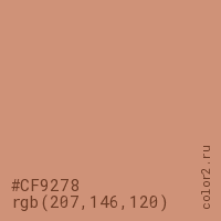 Цвет #CF9278 в цветовой модели RGB обозначается тремя октетами (207, 146, 120) в десятичном формате и #CF9278 в шестнадцатиричном (hex) формате, которые являются интенсивностью красного 207 (hex CF), интенсивность зелёного 146 (hex 92) и интенсивность синего 120 (hex 78).