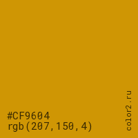 Цвет #CF9604 в цветовой модели RGB обозначается тремя октетами (207, 150, 4) в десятичном формате и #CF9604 в шестнадцатиричном (hex) формате, которые являются интенсивностью красного 207 (hex CF), интенсивность зелёного 150 (hex 96) и интенсивность синего 4 (hex 04).