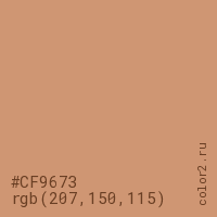 Цвет #CF9673 в цветовой модели RGB обозначается тремя октетами (207, 150, 115) в десятичном формате и #CF9673 в шестнадцатиричном (hex) формате, которые являются интенсивностью красного 207 (hex CF), интенсивность зелёного 150 (hex 96) и интенсивность синего 115 (hex 73).
