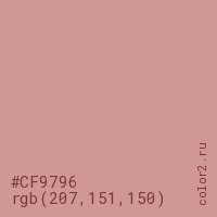 Цвет #CF9796 в цветовой модели RGB обозначается тремя октетами (207, 151, 150) в десятичном формате и #CF9796 в шестнадцатиричном (hex) формате, которые являются интенсивностью красного 207 (hex CF), интенсивность зелёного 151 (hex 97) и интенсивность синего 150 (hex 96).