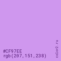 Цвет #CF97EE в цветовой модели RGB обозначается тремя октетами (207, 151, 238) в десятичном формате и #CF97EE в шестнадцатиричном (hex) формате, которые являются интенсивностью красного 207 (hex CF), интенсивность зелёного 151 (hex 97) и интенсивность синего 238 (hex EE).