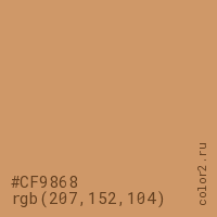 Цвет #CF9868 в цветовой модели RGB обозначается тремя октетами (207, 152, 104) в десятичном формате и #CF9868 в шестнадцатиричном (hex) формате, которые являются интенсивностью красного 207 (hex CF), интенсивность зелёного 152 (hex 98) и интенсивность синего 104 (hex 68).