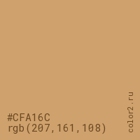 Цвет #CFA16C в цветовой модели RGB обозначается тремя октетами (207, 161, 108) в десятичном формате и #CFA16C в шестнадцатиричном (hex) формате, которые являются интенсивностью красного 207 (hex CF), интенсивность зелёного 161 (hex A1) и интенсивность синего 108 (hex 6C).