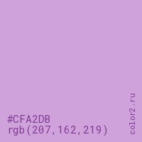 Цвет #CFA2DB в цветовой модели RGB обозначается тремя октетами (207, 162, 219) в десятичном формате и #CFA2DB в шестнадцатиричном (hex) формате, которые являются интенсивностью красного 207 (hex CF), интенсивность зелёного 162 (hex A2) и интенсивность синего 219 (hex DB).
