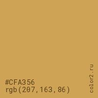 Цвет #CFA356 в цветовой модели RGB обозначается тремя октетами (207, 163, 86) в десятичном формате и #CFA356 в шестнадцатиричном (hex) формате, которые являются интенсивностью красного 207 (hex CF), интенсивность зелёного 163 (hex A3) и интенсивность синего 86 (hex 56).