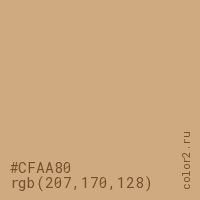 Цвет #CFAA80 в цветовой модели RGB обозначается тремя октетами (207, 170, 128) в десятичном формате и #CFAA80 в шестнадцатиричном (hex) формате, которые являются интенсивностью красного 207 (hex CF), интенсивность зелёного 170 (hex AA) и интенсивность синего 128 (hex 80).