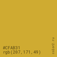 Цвет #CFAB31 в цветовой модели RGB обозначается тремя октетами (207, 171, 49) в десятичном формате и #CFAB31 в шестнадцатиричном (hex) формате, которые являются интенсивностью красного 207 (hex CF), интенсивность зелёного 171 (hex AB) и интенсивность синего 49 (hex 31).