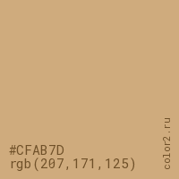 Цвет #CFAB7D в цветовой модели RGB обозначается тремя октетами (207, 171, 125) в десятичном формате и #CFAB7D в шестнадцатиричном (hex) формате, которые являются интенсивностью красного 207 (hex CF), интенсивность зелёного 171 (hex AB) и интенсивность синего 125 (hex 7D).