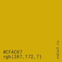 Цвет #CFAC07 в цветовой модели RGB обозначается тремя октетами (207, 172, 7) в десятичном формате и #CFAC07 в шестнадцатиричном (hex) формате, которые являются интенсивностью красного 207 (hex CF), интенсивность зелёного 172 (hex AC) и интенсивность синего 7 (hex 07).