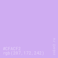 Цвет #CFACF2 в цветовой модели RGB обозначается тремя октетами (207, 172, 242) в десятичном формате и #CFACF2 в шестнадцатиричном (hex) формате, которые являются интенсивностью красного 207 (hex CF), интенсивность зелёного 172 (hex AC) и интенсивность синего 242 (hex F2).