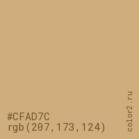 Цвет #CFAD7C в цветовой модели RGB обозначается тремя октетами (207, 173, 124) в десятичном формате и #CFAD7C в шестнадцатиричном (hex) формате, которые являются интенсивностью красного 207 (hex CF), интенсивность зелёного 173 (hex AD) и интенсивность синего 124 (hex 7C).