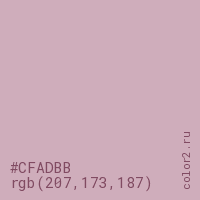 Цвет #CFADBB в цветовой модели RGB обозначается тремя октетами (207, 173, 187) в десятичном формате и #CFADBB в шестнадцатиричном (hex) формате, которые являются интенсивностью красного 207 (hex CF), интенсивность зелёного 173 (hex AD) и интенсивность синего 187 (hex BB).