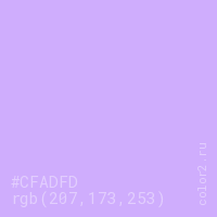 Цвет #CFADFD в цветовой модели RGB обозначается тремя октетами (207, 173, 253) в десятичном формате и #CFADFD в шестнадцатиричном (hex) формате, которые являются интенсивностью красного 207 (hex CF), интенсивность зелёного 173 (hex AD) и интенсивность синего 253 (hex FD).