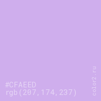 Цвет #CFAEED в цветовой модели RGB обозначается тремя октетами (207, 174, 237) в десятичном формате и #CFAEED в шестнадцатиричном (hex) формате, которые являются интенсивностью красного 207 (hex CF), интенсивность зелёного 174 (hex AE) и интенсивность синего 237 (hex ED).