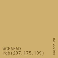 Цвет #CFAF6D в цветовой модели RGB обозначается тремя октетами (207, 175, 109) в десятичном формате и #CFAF6D в шестнадцатиричном (hex) формате, которые являются интенсивностью красного 207 (hex CF), интенсивность зелёного 175 (hex AF) и интенсивность синего 109 (hex 6D).