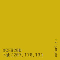 Цвет #CFB20D в цветовой модели RGB обозначается тремя октетами (207, 178, 13) в десятичном формате и #CFB20D в шестнадцатиричном (hex) формате, которые являются интенсивностью красного 207 (hex CF), интенсивность зелёного 178 (hex B2) и интенсивность синего 13 (hex 0D).