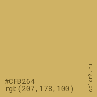 Цвет #CFB264 в цветовой модели RGB обозначается тремя октетами (207, 178, 100) в десятичном формате и #CFB264 в шестнадцатиричном (hex) формате, которые являются интенсивностью красного 207 (hex CF), интенсивность зелёного 178 (hex B2) и интенсивность синего 100 (hex 64).