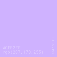 Цвет #CFB2FF в цветовой модели RGB обозначается тремя октетами (207, 178, 255) в десятичном формате и #CFB2FF в шестнадцатиричном (hex) формате, которые являются интенсивностью красного 207 (hex CF), интенсивность зелёного 178 (hex B2) и интенсивность синего 255 (hex FF).