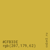 Цвет #CFB33E в цветовой модели RGB обозначается тремя октетами (207, 179, 62) в десятичном формате и #CFB33E в шестнадцатиричном (hex) формате, которые являются интенсивностью красного 207 (hex CF), интенсивность зелёного 179 (hex B3) и интенсивность синего 62 (hex 3E).