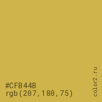 Цвет #CFB44B в цветовой модели RGB обозначается тремя октетами (207, 180, 75) в десятичном формате и #CFB44B в шестнадцатиричном (hex) формате, которые являются интенсивностью красного 207 (hex CF), интенсивность зелёного 180 (hex B4) и интенсивность синего 75 (hex 4B).