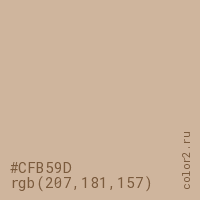 Цвет #CFB59D в цветовой модели RGB обозначается тремя октетами (207, 181, 157) в десятичном формате и #CFB59D в шестнадцатиричном (hex) формате, которые являются интенсивностью красного 207 (hex CF), интенсивность зелёного 181 (hex B5) и интенсивность синего 157 (hex 9D).