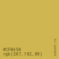 Цвет #CFB650 в цветовой модели RGB обозначается тремя октетами (207, 182, 80) в десятичном формате и #CFB650 в шестнадцатиричном (hex) формате, которые являются интенсивностью красного 207 (hex CF), интенсивность зелёного 182 (hex B6) и интенсивность синего 80 (hex 50).