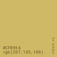 Цвет #CFB964 в цветовой модели RGB обозначается тремя октетами (207, 185, 100) в десятичном формате и #CFB964 в шестнадцатиричном (hex) формате, которые являются интенсивностью красного 207 (hex CF), интенсивность зелёного 185 (hex B9) и интенсивность синего 100 (hex 64).