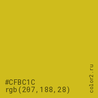 Цвет #CFBC1C в цветовой модели RGB обозначается тремя октетами (207, 188, 28) в десятичном формате и #CFBC1C в шестнадцатиричном (hex) формате, которые являются интенсивностью красного 207 (hex CF), интенсивность зелёного 188 (hex BC) и интенсивность синего 28 (hex 1C).