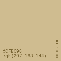 Цвет #CFBC90 в цветовой модели RGB обозначается тремя октетами (207, 188, 144) в десятичном формате и #CFBC90 в шестнадцатиричном (hex) формате, которые являются интенсивностью красного 207 (hex CF), интенсивность зелёного 188 (hex BC) и интенсивность синего 144 (hex 90).